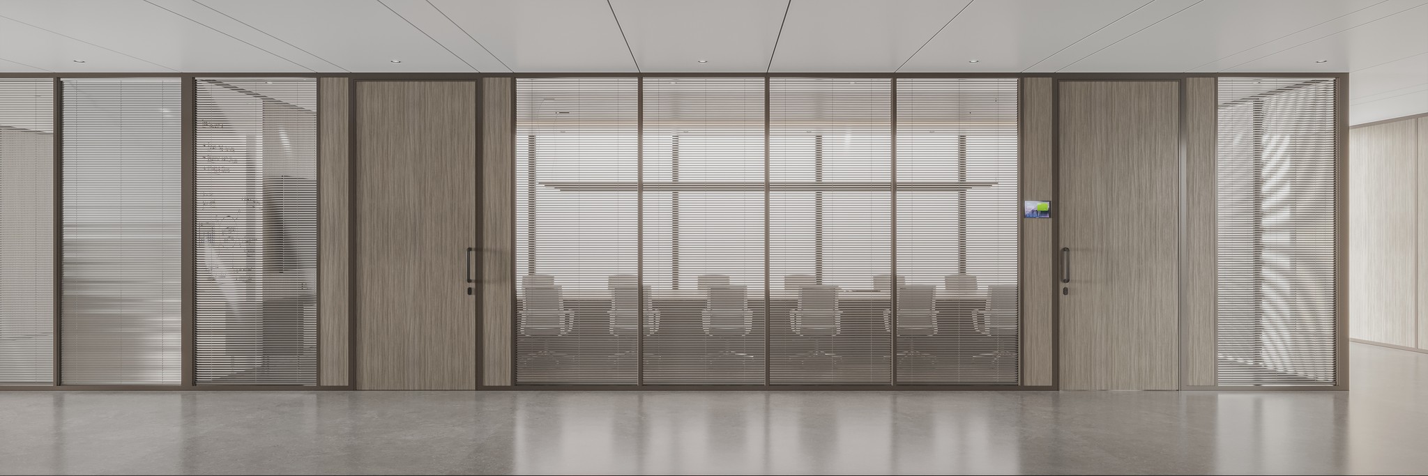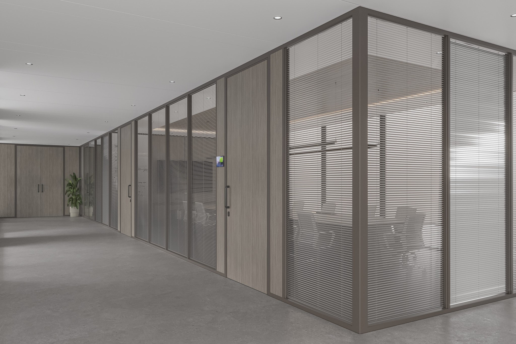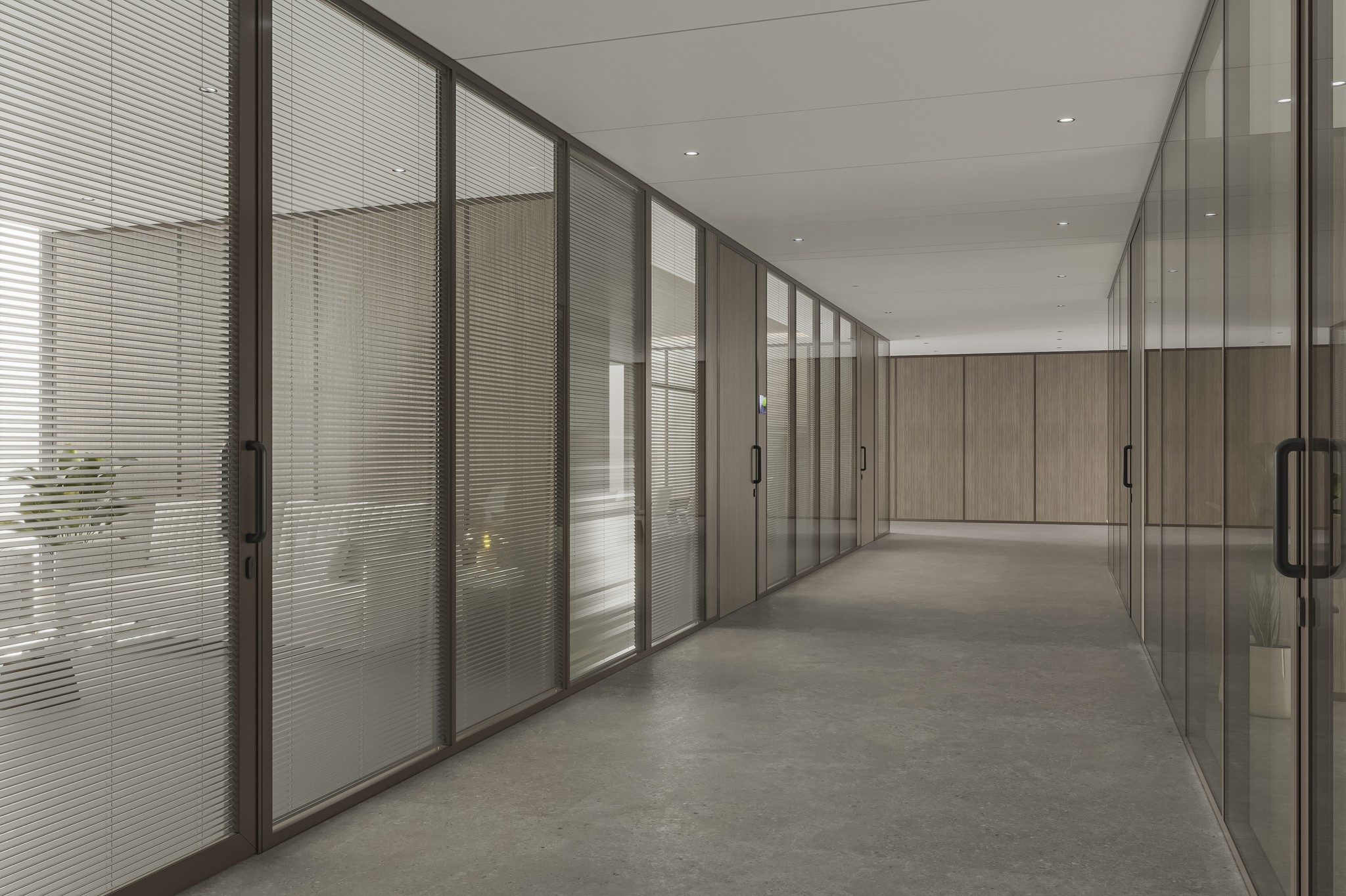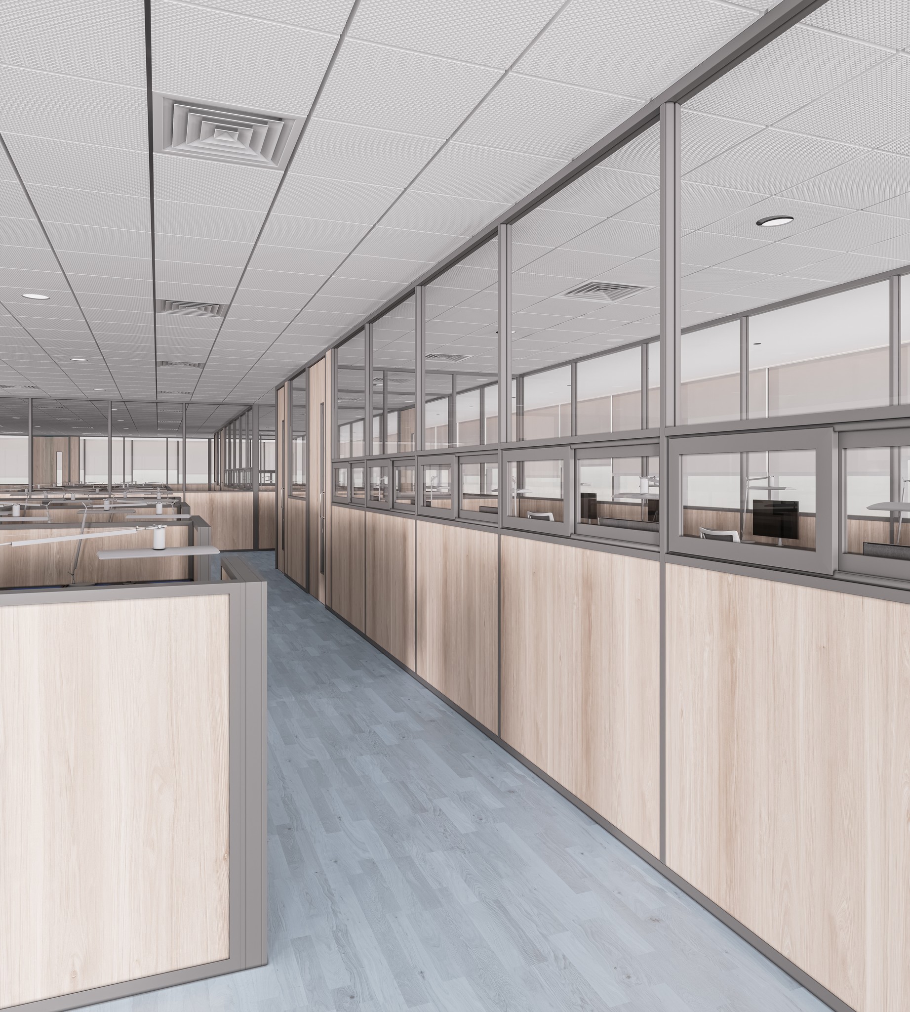 UNI 80 Series partitions ensure visual continuity across corridors, passages, and waiting areas. The system maintains a consistent design language while clearly guiding movement and spatial flow throughout the workplace.