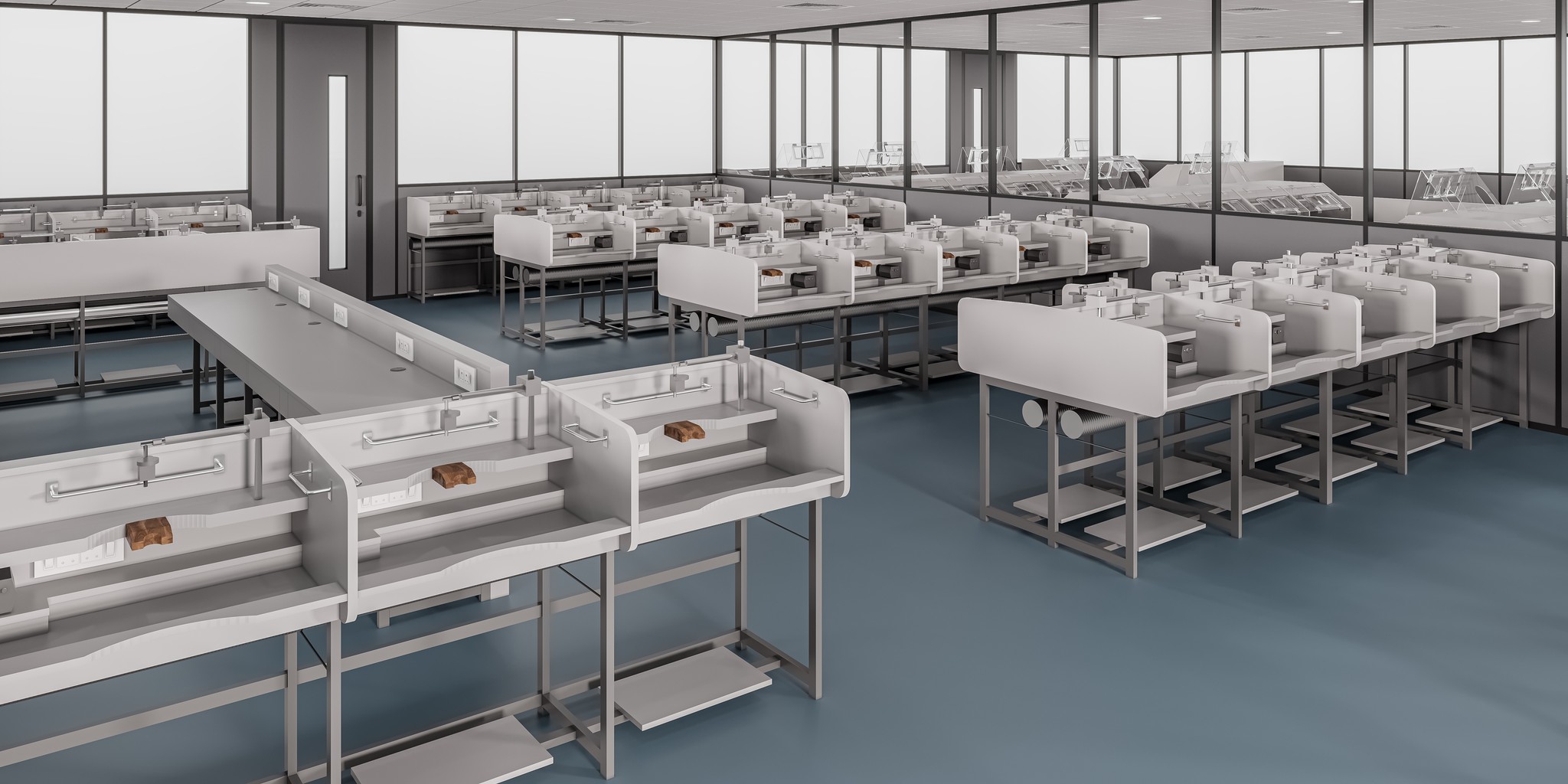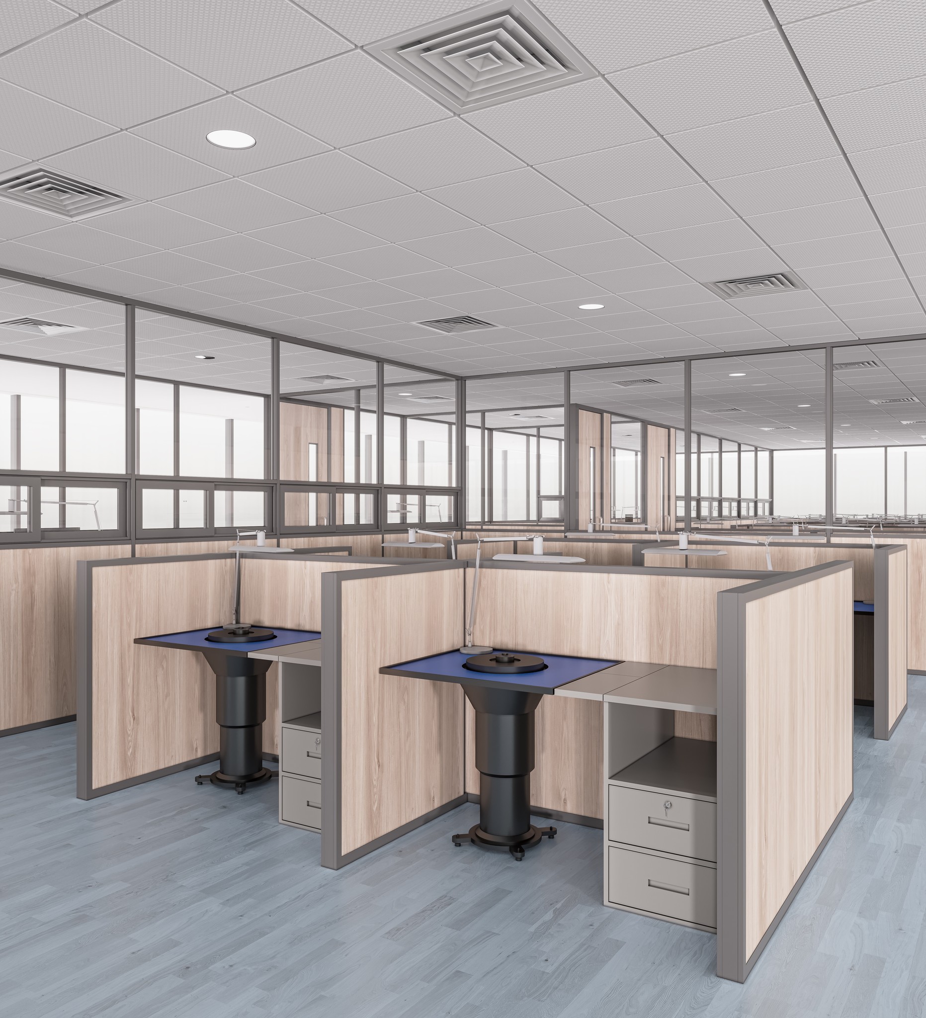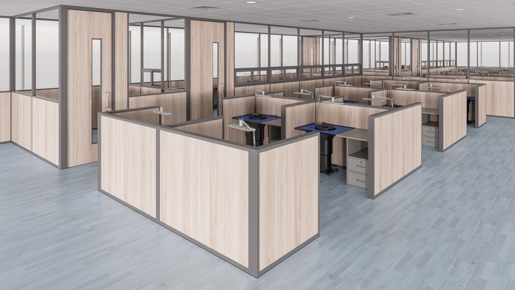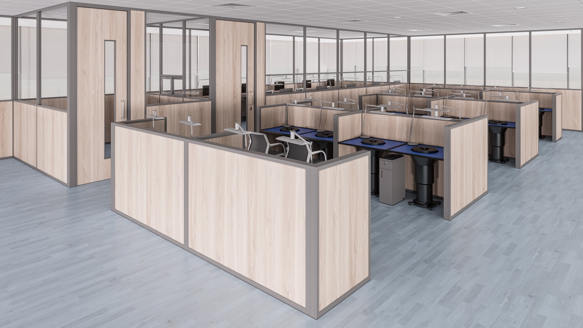 The UNI 80 system supports low-height partitioning (C-60 Series) for structured workstation layouts. These configurations define personal work zones while maintaining openness, supervision visibility, and efficient space utilization, ideal for large operational floors.