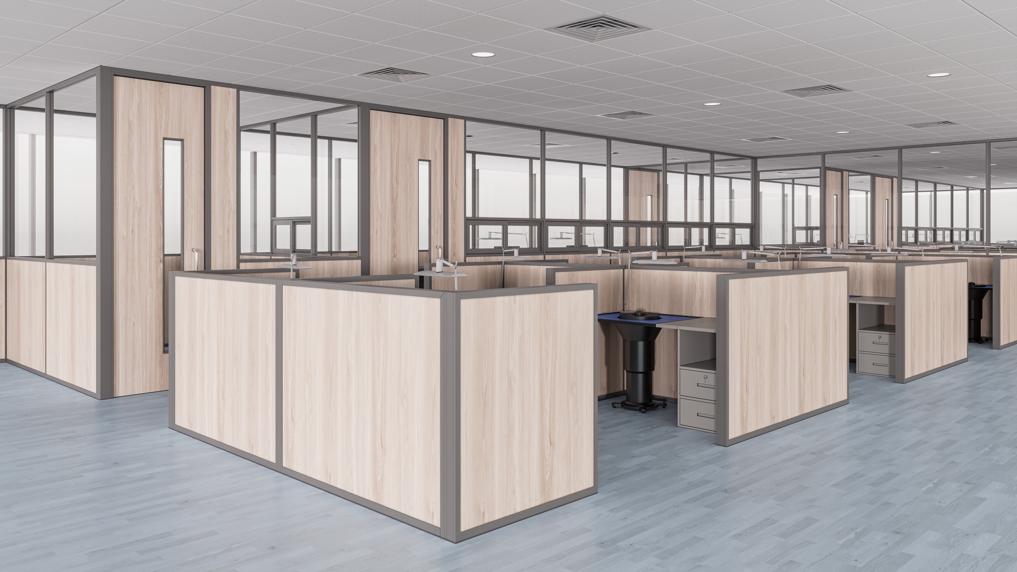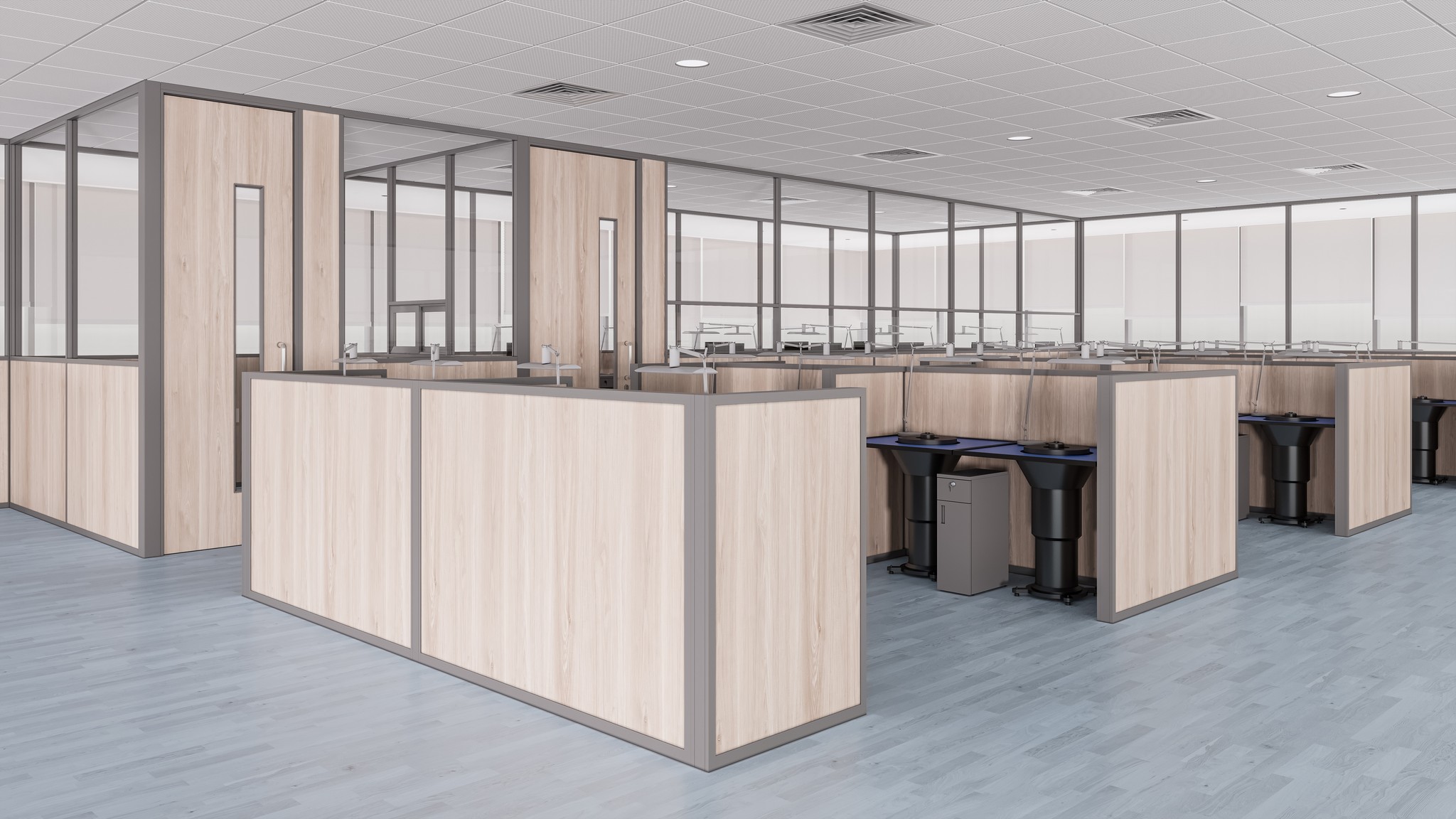 By combining solid panels with glass, UNI 80 Series enables privacy where required without fully enclosing spaces. Solid infills can be finished in laminates or soft boards, allowing functional zoning, pin-up areas, and acoustic absorption within the same partition line.