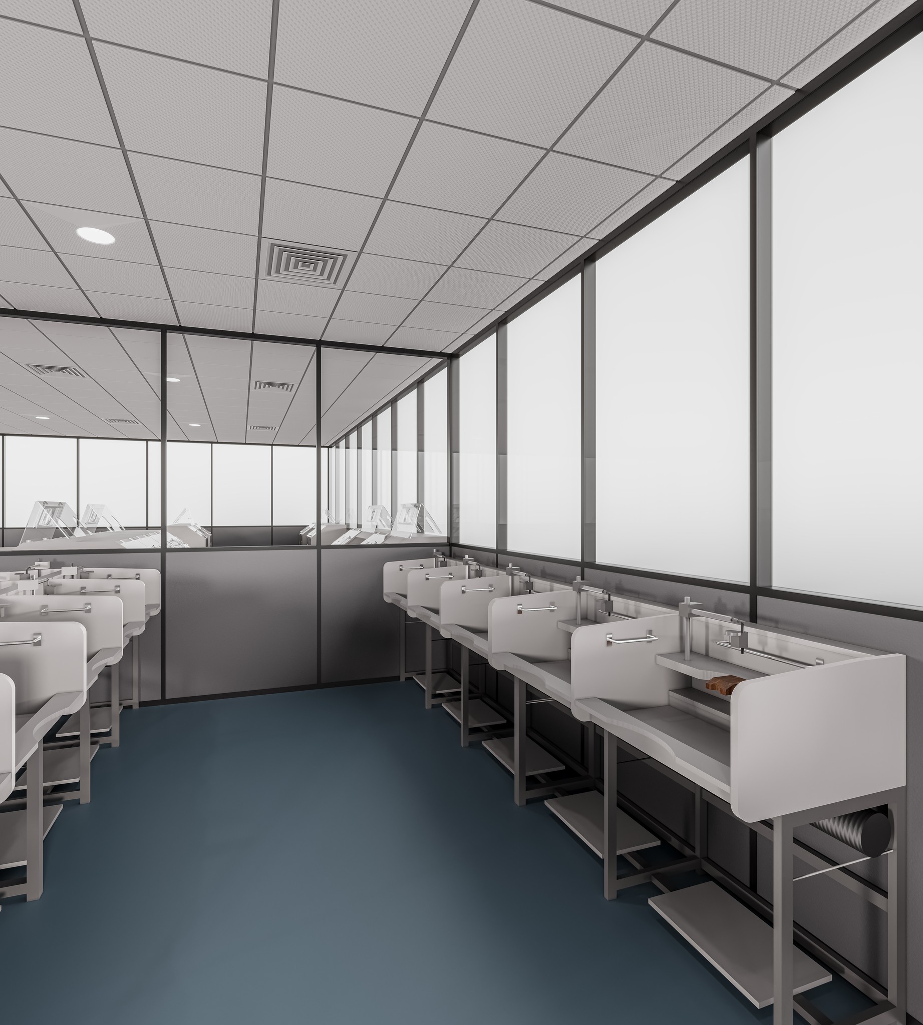Full height glass partitions in the UNI 80 series create open, light - filled vibrant workspaces while maintaining spatial clarity and organization. The system supports single and double glass options, making it suitable for both visual openness and enhanced acoustic control. This is specially designed for Diamond Industry for Maximum Privacy.